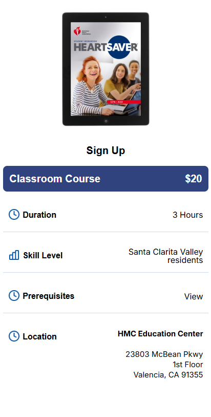 Henry Mayo Newhall Hospital is happy to offer Heartsaver® CPR AED Certifications to Santa Clarita Valley residents. Heartsaver® CPR AED is a classroom, video-based, instructor-led American Heart Association (AHA) course that teaches adult, child, and infant CPR and AED use, as well as how to relieve choking on an adult and infant. This course teaches skills with AHA’s research-proven Practice-While-Watching (PWW) technique, which allows instructors to observe the students, provide feedback and guide the students’ learning of skills.